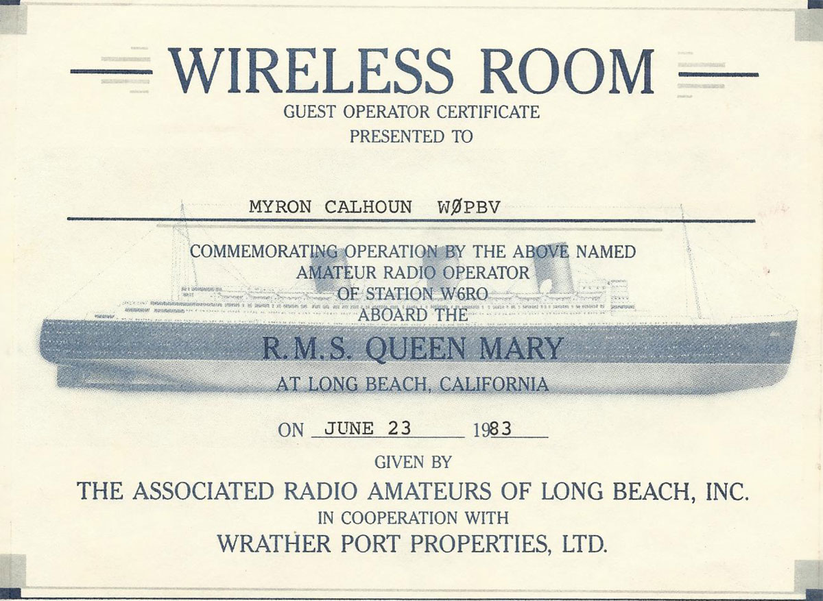 Myron Calhoun says, "It was a long time ago when I operated from the Queen Mary's radio room (while it was -- and still is -- "parked" and acting as a tourist attraction in Long Beach, CA), but I was a MAARS member then."