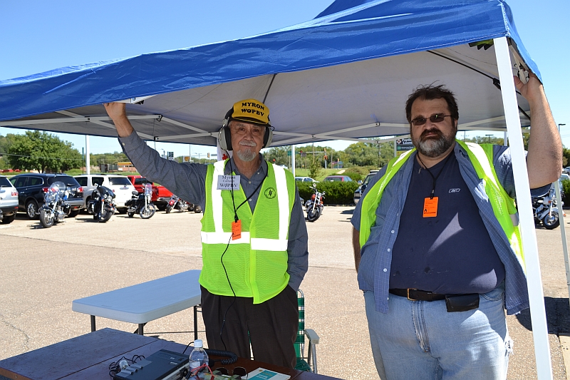 This picture was taken around September 2012, showing Jim Foster, KDØNQQ, and Myron Calhoun, WØPBV, working communication for the Kansas Ride-for-the-Red (Cross) fund-raising motorcycle ride.